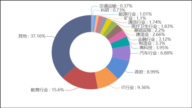 國內挖礦感染數(shù)量行業(yè)分布情況如下圖所示,主要受害行業(yè)以教育行業(yè)為主,其次是IT行業(yè)和政府。