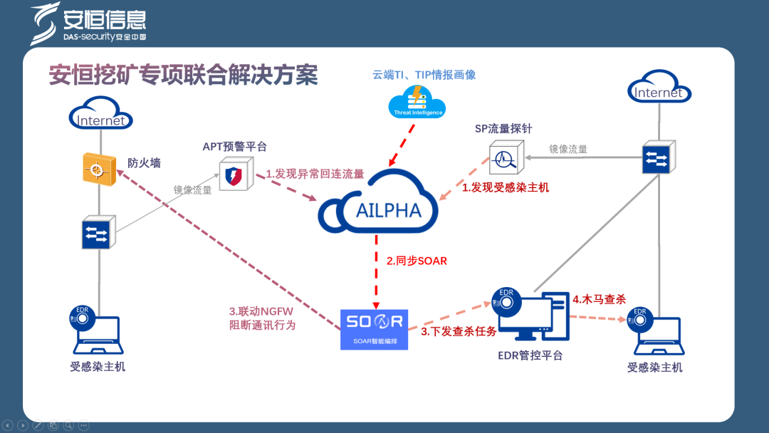 方案以AiLPHA大數(shù)據智能安全平臺為中心,依托于深耕多年的安全事件分析引擎,配合APT、AiNTA等探針全面的攻擊檢測能力,對全網流量進行深度解析,對關鍵區(qū)域惡意文件分析數(shù)據以及全網各安全設備告警日志進行集中收集、治理、分析、存儲,精準定位挖礦程序以及挖礦行為。