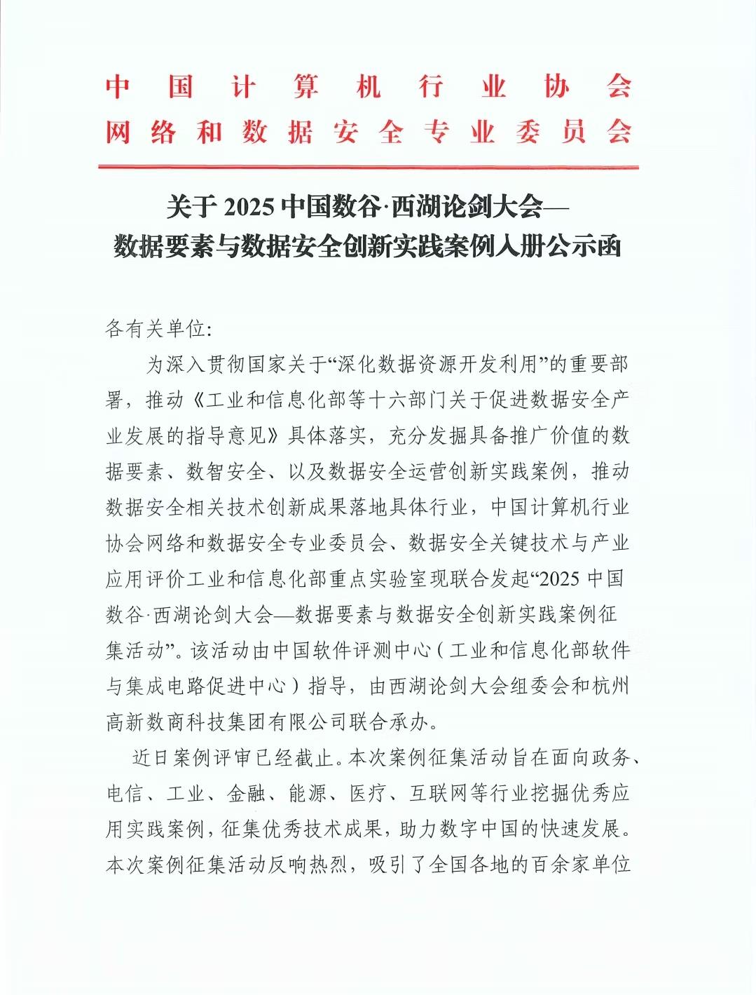 關(guān)于2025中國數(shù)谷·西湖論劍大會—數(shù)據(jù)要素與數(shù)據(jù)安全創(chuàng)新實踐案例入冊公示函