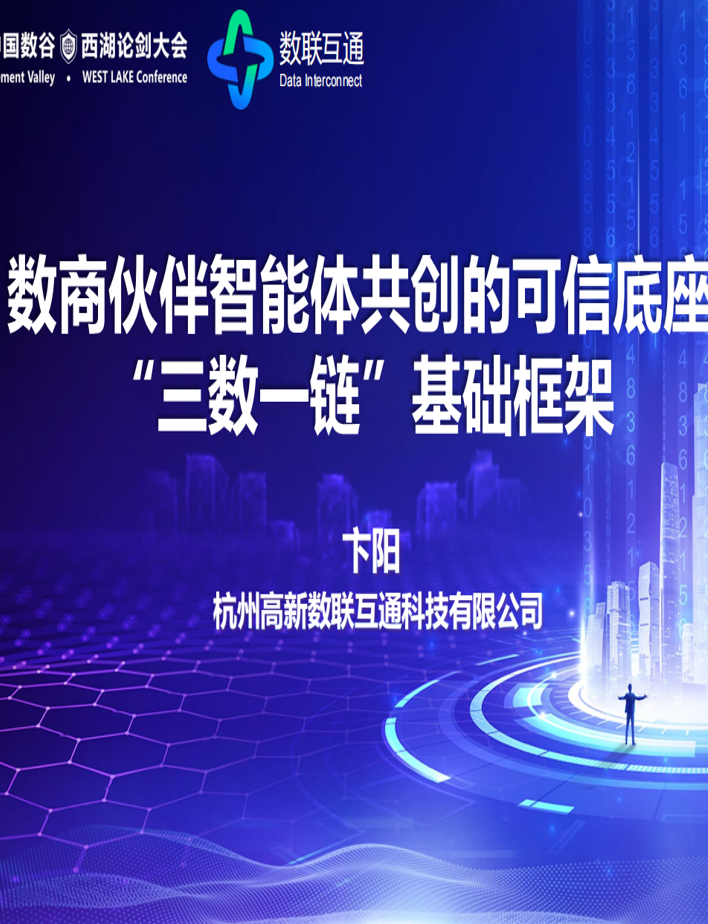 在5月10日下午舉行的數據安全流通論壇上,來自杭州高新數聯互通科技有限公司的卞陽圍繞著數商伙伴智能體共創(chuàng)的可信底座 “三數一鏈”基礎框架進行了演講,在演講上系統(tǒng)闡述了公司在構建數商伙伴智能體共創(chuàng)的可信底座方面的戰(zhàn)略與實踐。核心內容圍繞 “三數一鏈”基礎框架(數據發(fā)展<數字證書>、數據發(fā)票、數據交易場所、區(qū)塊鏈跨鏈互認)展開,旨在為智能體的協(xié)同創(chuàng)新提供安全、可信、合規(guī)的數據流通環(huán)境。文檔突出了中國數谷作為國家數據要素市場化改革試驗田的定位,展示了數聯互通公司通過開源共創(chuàng)平臺整合120余家數商、構建多行業(yè)可信數據空間、推動數據資源與智能體應用價值轉化的成果,最終目標是形成“共創(chuàng)、共建、共贏”的數商智能體生態(tài),支撐全國一體化數據市場建設。