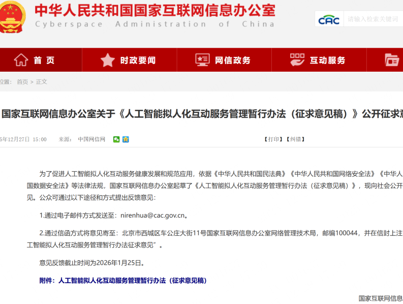 劃重點(diǎn)|事關(guān)AI擬人化互動(dòng)!國(guó)家網(wǎng)信辦發(fā)布最新辦法公開征求意見