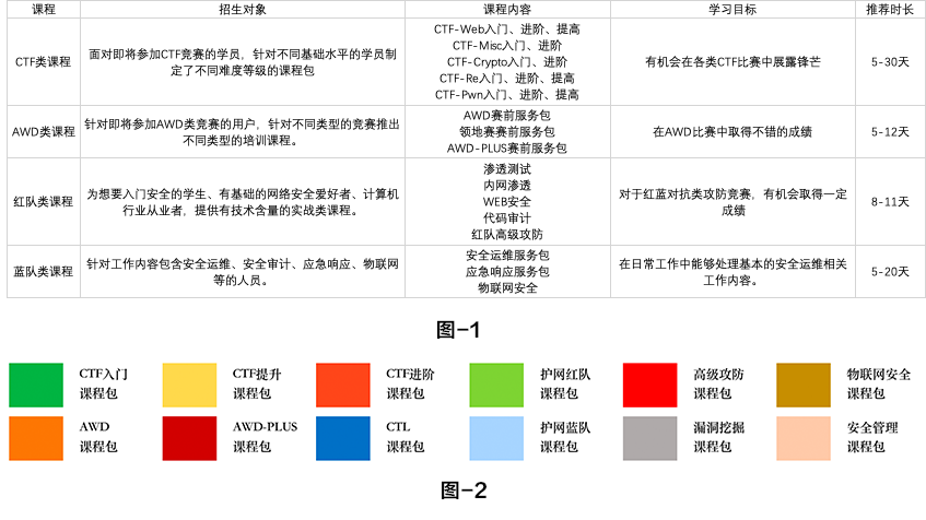 還提供基于已有課程內(nèi)容的組合包服務(wù),例如針對(duì)CTF的初、中、高階的培訓(xùn)需求,針對(duì)常規(guī)滲透、高級(jí)攻防的需求,以及新興領(lǐng)域物聯(lián)網(wǎng)安全的需求等,如圖-2就是一些常見(jiàn)的課程包。