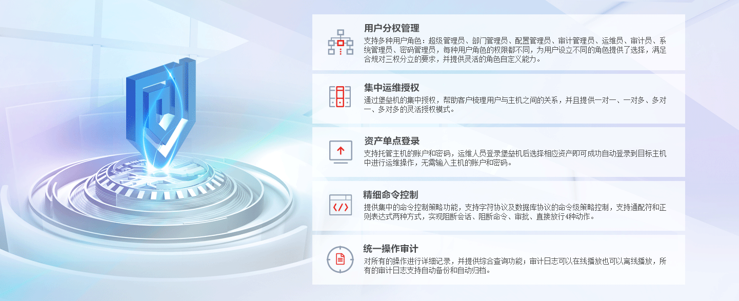 精細控制,全程審計:權(quán)限精細劃分,操作全程錄像審計,安全加倍。