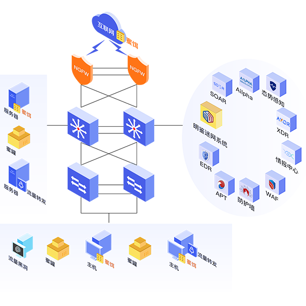 · 利用蜜罐捕捉攻擊流量映射至APT等檢測(cè)設(shè)備進(jìn)行深度分析,增加橫向威脅感知;