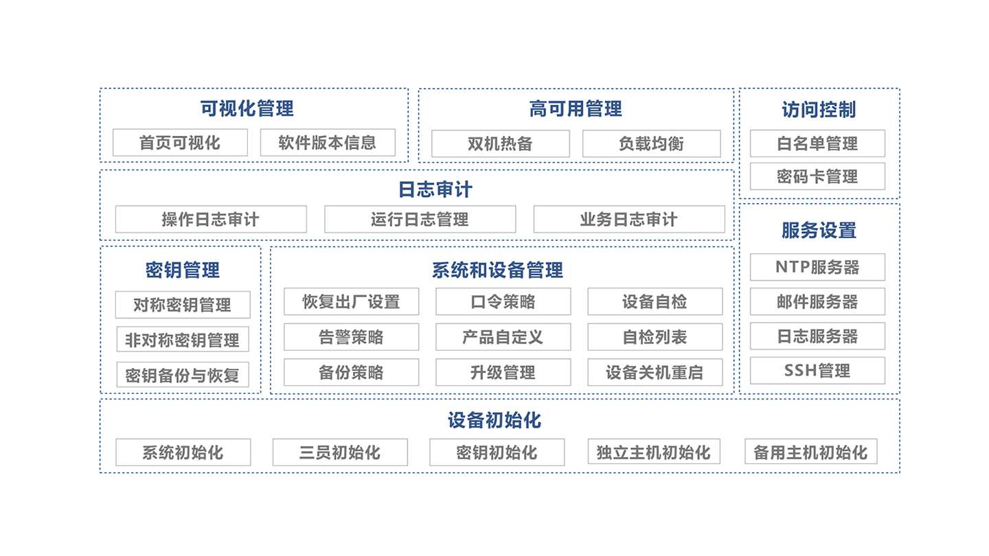 產(chǎn)品初始化向?qū)б龑?dǎo)用戶快速完成設(shè)備初始化的流程,完成設(shè)備工作狀態(tài)的轉(zhuǎn)換,快速上手服務(wù)器密碼機(jī)