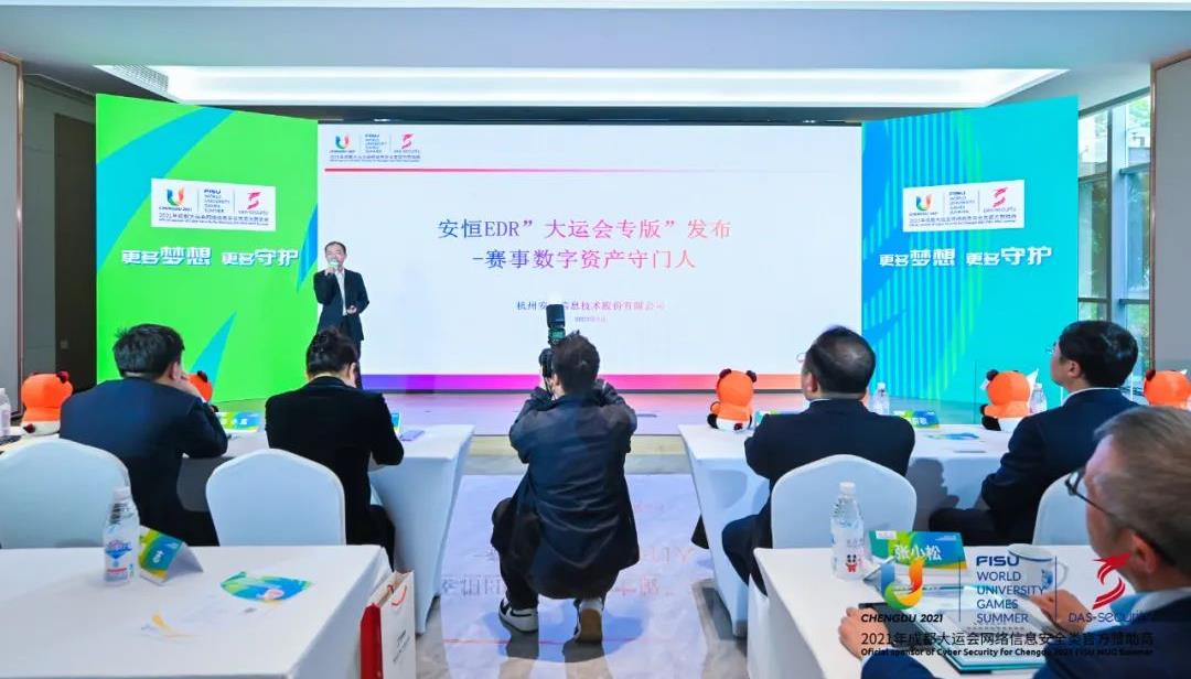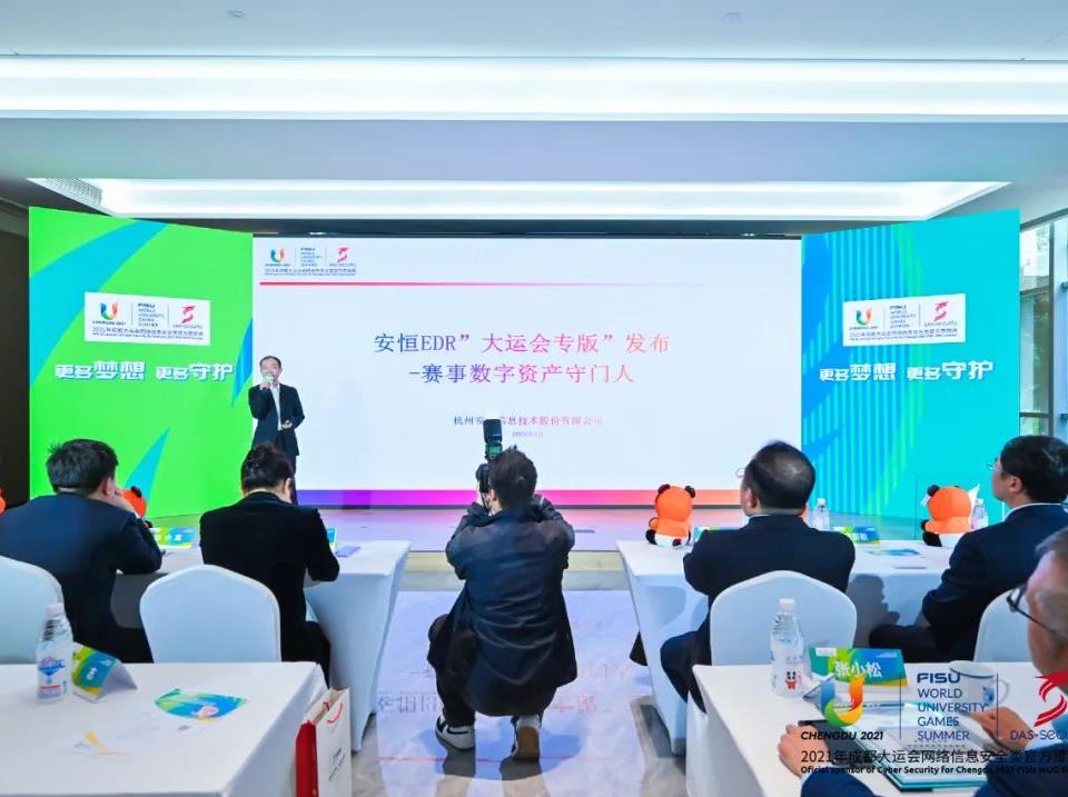 4月7日,成都大運會(網絡信息安全類)官方贊助商安恒信息升級發(fā)布會暨“西部網絡安全總部”啟動儀式在成都高新區(qū)安恒大廈舉行。安恒信息成為了從成都大運會的“賽事合伙人”進而成為“城市合伙人”的成功典范,創(chuàng)造了數(shù)個“首個”。現(xiàn)場,安恒EDR“大運會專版”重磅發(fā)布,安恒信息副總裁劉思宇作專題匯報。對于安恒EDR大運會專版的發(fā)布,劉思宇提出四大關鍵詞“智能、實戰(zhàn)、簡單、責任”,體現(xiàn)了安恒終端安全對于大型賽事網絡安全保障的信念和態(tài)度。