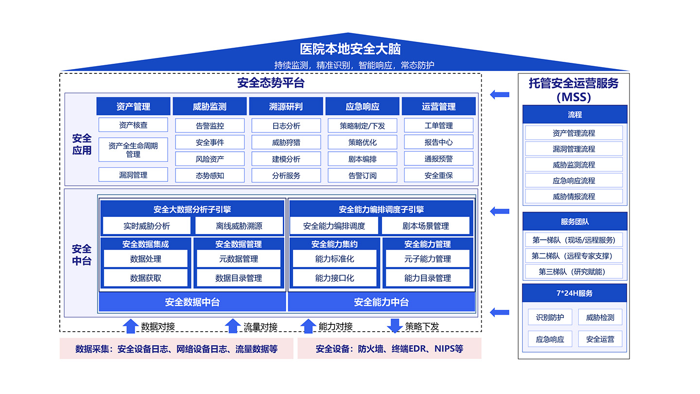 醫(yī)院安全態(tài)勢感知體系解決方案由兩部分組成,第一部分為部署在醫(yī)院本地端的安全態(tài)勢感知平臺,另一部分為云端的安全托管運營服務(wù)MSS。通過線上服務(wù)與線下平臺相結(jié)合,提供安全持續(xù)運營能力,安全威脅先發(fā)現(xiàn)、先研判、先處置。