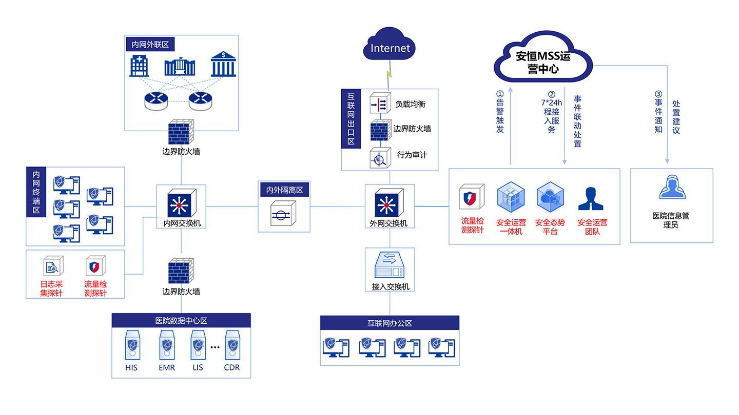 1.在核心機(jī)房部署態(tài)勢感知平臺:用于分析流量采集探針和日志采集探針的分析結(jié)果,同時與云端安全托管運營服務(wù)MSS配合,作為MSS安全信息來源,面向醫(yī)院提供整體安全閉環(huán)管理;