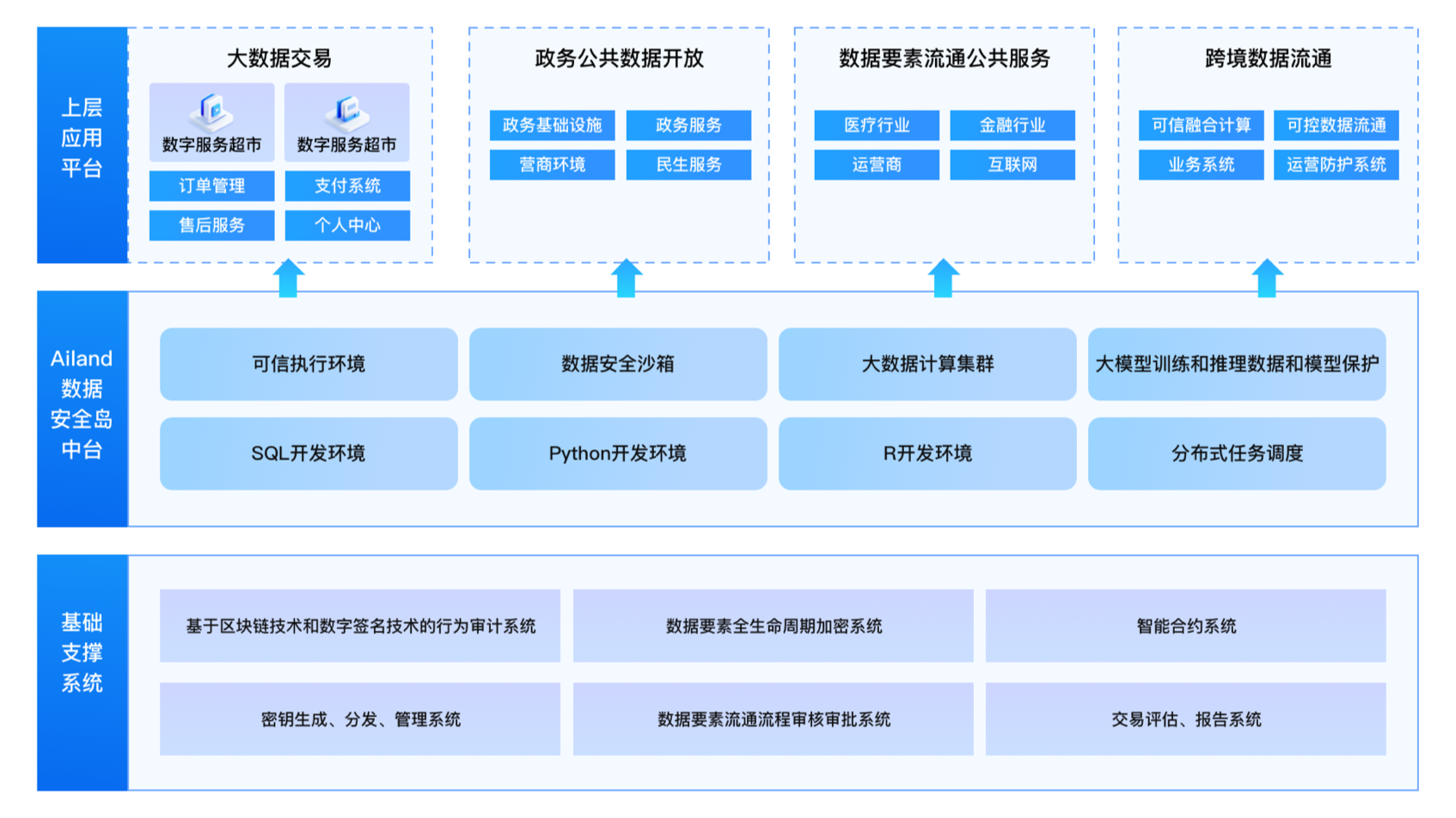 AiLand數(shù)據(jù)安全島(TEE)平臺是一個專注于保障數(shù)據(jù)安全流通,致力于解決數(shù)據(jù)共享的信任和隱私保護問題的數(shù)據(jù)開放和共享交換平臺。應用機密計算、安全計算沙箱、區(qū)塊鏈等多種前沿技術(shù),配合關(guān)鍵行為數(shù)字驗簽和全業(yè)務流程追蹤審計技術(shù),實現(xiàn)共享數(shù)據(jù)的所有權(quán)和使用權(quán)分離,確保數(shù)據(jù) “可用不可見”,保障數(shù)據(jù)共享交換過程的可靠、可控和可溯。