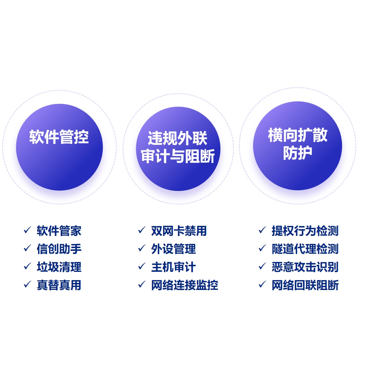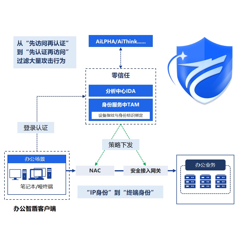 辦公智盾提出新一代的終端一體化安全防護(hù)理念和解決方案,超越傳統(tǒng)思維,從單一終端安全,變成人員、終端、網(wǎng)絡(luò)、應(yīng)用、數(shù)據(jù)全方位一體化安全。辦公智盾基于模塊化設(shè)計(jì)理念,集多種安全模塊于一體,融合了準(zhǔn)入、零信任、防病毒、數(shù)據(jù)防泄漏、數(shù)字水印、文件加密、主機(jī)審計(jì)、桌面管理等十多種業(yè)務(wù),全面兼容Windows、Linux、MacOS、UOS、麒麟等主流操作系統(tǒng),一個(gè)平臺,一個(gè)終端,統(tǒng)一管理。滿足用戶核心應(yīng)用景,包括遠(yuǎn)程接入場景、威脅入侵防護(hù)場景、商業(yè)秘密保護(hù)場景、桌面管控場景。