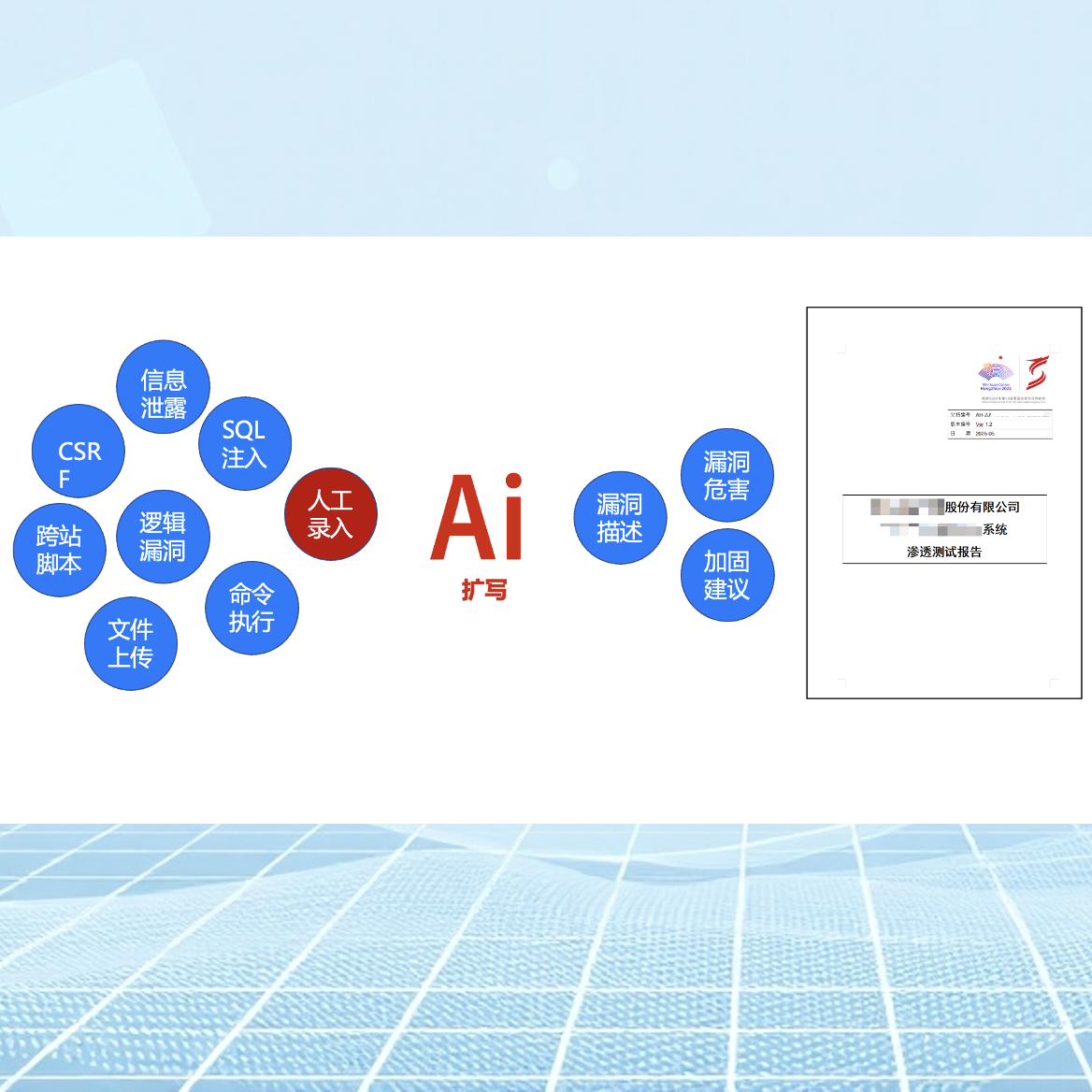 - 通過(guò)大模型,自動(dòng)分析各類掃描工具的掃描結(jié)果(或者是人工錄入的簡(jiǎn)單漏洞描述),自動(dòng)生成相應(yīng)的漏洞描述、漏洞危害、加固建議等專業(yè)內(nèi)容,根據(jù)報(bào)告模板,一鍵生成標(biāo)準(zhǔn)化的測(cè)試報(bào)告。