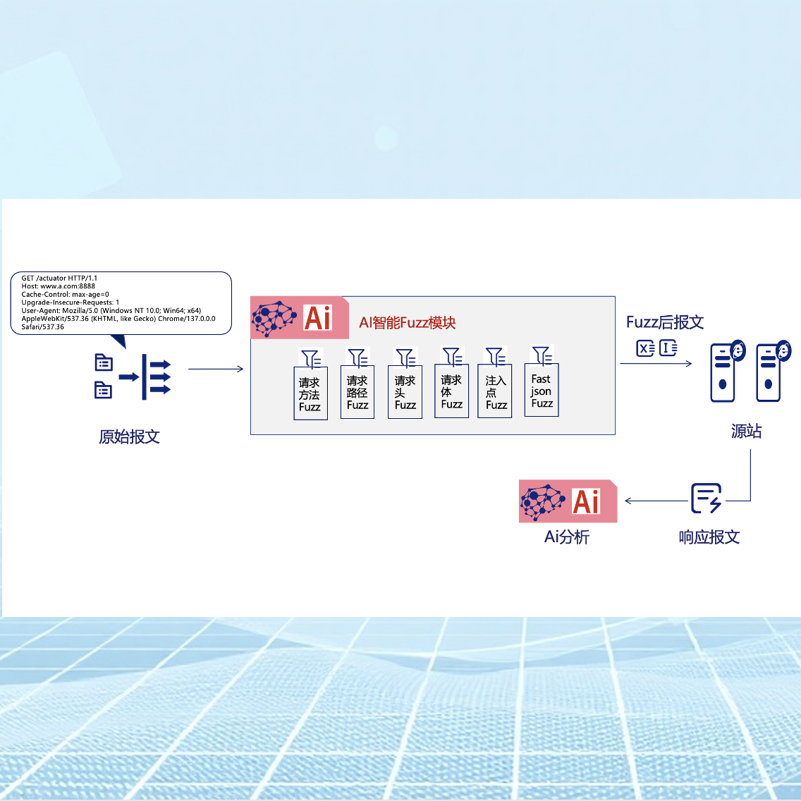 - 平臺(tái)具備自動(dòng)捕獲頁(yè)面觸發(fā)的所有HTTP請(qǐng)求能力,并自動(dòng)將被動(dòng)發(fā)現(xiàn)的流量持續(xù)地發(fā)送至后臺(tái)進(jìn)行分析。結(jié)合AI驅(qū)動(dòng)的被動(dòng)流量Fuzz(模糊測(cè)試)能力,能夠模擬人的經(jīng)驗(yàn),自動(dòng)化地對(duì)請(qǐng)求方法、URL、請(qǐng)求頭及請(qǐng)求體進(jìn)行變異模糊測(cè)試,并通過(guò)AI智能分析響應(yīng),精準(zhǔn)識(shí)別異常行為。Fuzz測(cè)試能夠有效補(bǔ)充傳統(tǒng)測(cè)試方法的不足,提高軟件的健壯性和安全性,發(fā)現(xiàn)未知的安全漏洞和錯(cuò)誤,降低安全風(fēng)險(xiǎn)。?