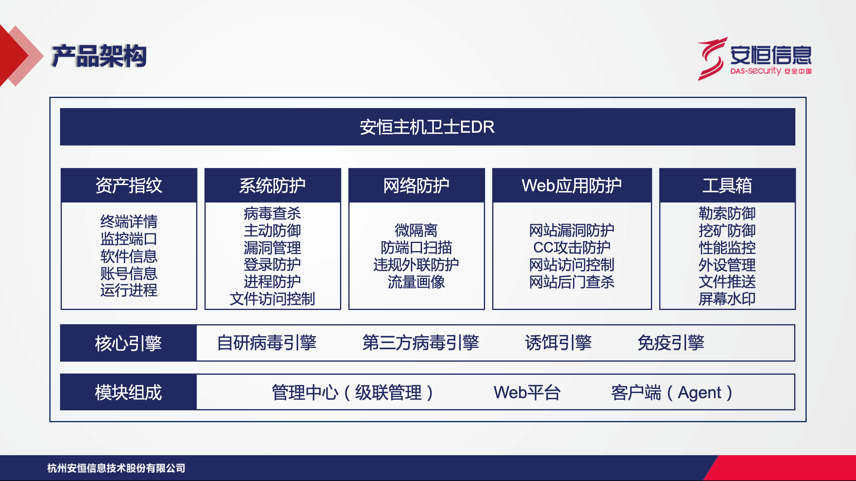 EDR不僅有自研病毒引擎、免疫引擎、誘餌引擎、第三方病毒引擎,而且具備豐富的脫殼能力,全面的模擬執(zhí)行能力(反病毒虛擬機(jī))。更具有全面的平臺(tái)支持(Windows、Linux等)和文件支持(壓縮文件、可執(zhí)行文件等),不僅可以滿足日常的病毒掃描以及查殺的需求,而且對(duì)于一些未知病毒和惡意程序的執(zhí)行也能做到監(jiān)控系統(tǒng)關(guān)鍵點(diǎn),實(shí)時(shí)阻斷,保證資產(chǎn)及數(shù)據(jù)安全。