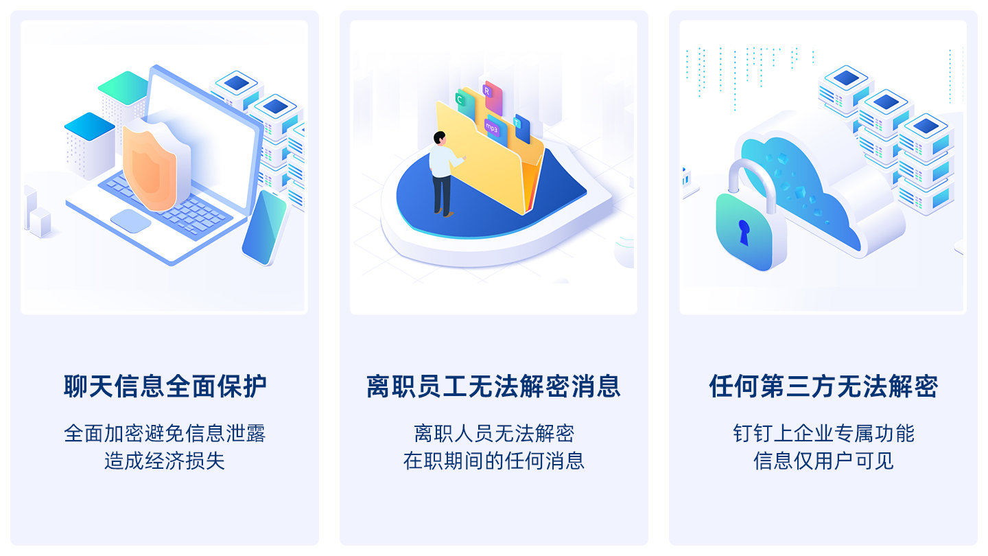產(chǎn)品采用國密標(biāo)準(zhǔn)算法,讓信息在傳輸、存儲(chǔ)過程中都是加密狀態(tài),實(shí)現(xiàn)密鑰、密文無法分離。除信息所有者外,任何第三方(包括釘釘)都無法查看,確保數(shù)據(jù)安全。