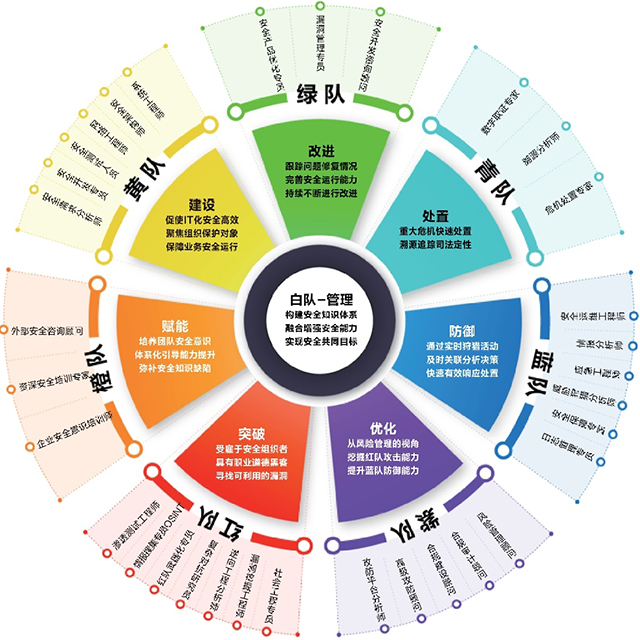 安恒信息安全服務團隊由九維安全能力專家構(gòu)成,其職責分別為:紅隊持續(xù)突破、橙隊擅于賦能、黃隊致力建設、綠隊跟蹤改進、青隊快速處置、藍隊實時防御,紫隊不斷優(yōu)化、暗隊專注情報和研究、白隊運營管理,以體系化的安全人才及技術(shù)為客戶賦能。