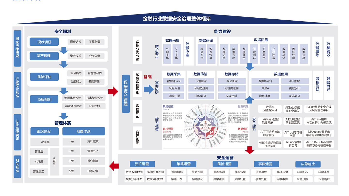 數(shù)據(jù)安全能力建設(shè),以數(shù)據(jù)安全分級為基礎(chǔ),建立覆蓋數(shù)據(jù)生命周期全過程的安全防護體系,防護要求以《金融數(shù)據(jù)安全數(shù)據(jù)生命周期安全規(guī)范》中的防護要求為依據(jù),以數(shù)據(jù)安全相關(guān)技術(shù)能力及產(chǎn)品為能力底座,全面加強金融行業(yè)數(shù)據(jù)安全保護能力。