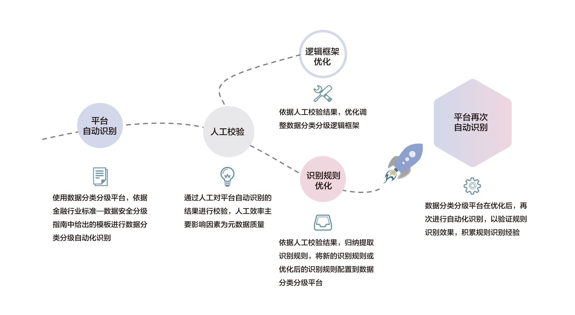 工具識別完之后再進行人工校驗,對工具的模型及識別規(guī)則進行策略調(diào)優(yōu),然后再以新的規(guī)則進行自動化識別,不斷提高分類分級打標的效率,為后續(xù)精細化數(shù)據(jù)安全防護提供精確的分類分級結(jié)果。